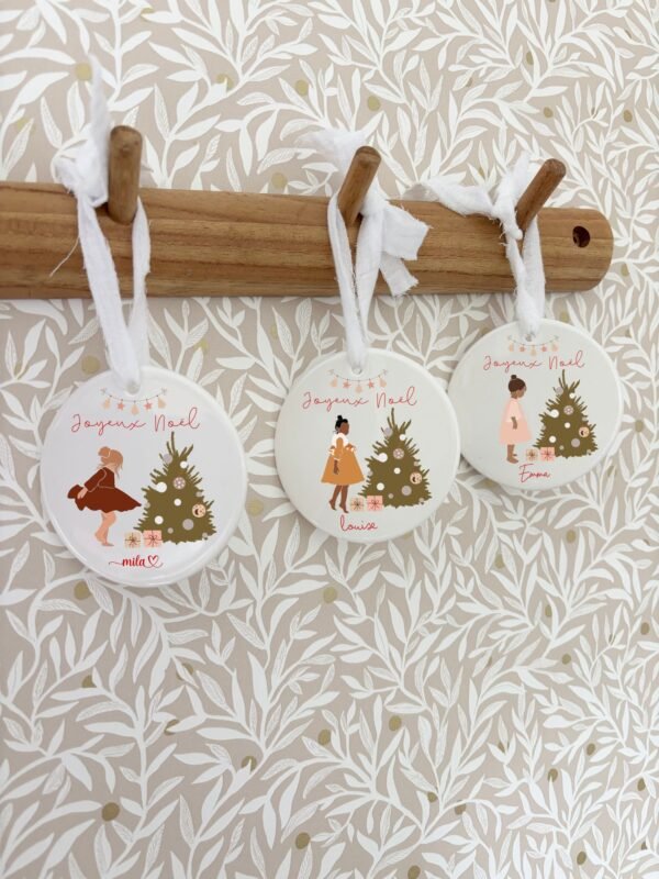 Boule de Noël en céramique personnalisée avec le prénom et l’illustration de votre choix. Idéale pour décorer votre sapin ou offrir un cadeau unique et attentionné. Chaque boule est imprimée avec soin pour garantir une finition brillante, durable et de qualité.