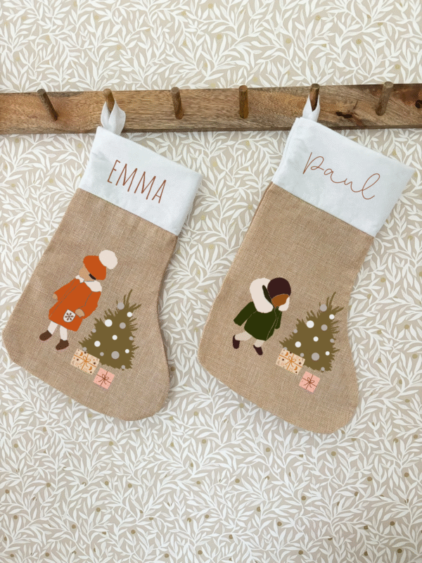 Rendez Noël encore plus magique avec cette chaussette de Noël personnalisable pour enfants ! Fabriquée dans un élégant mélange de jute naturelle et de coton blanc, elle est à la fois intemporelle et parfaite pour décorer votre maison pendant les fêtes. Chaque chaussette est personnalisée avec le prénom de l’enfant, ainsi qu’une illustration douce représentant une fillette près d’un sapin de Noël.