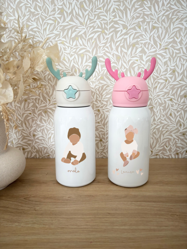 gourde personnalisée enfant, gourde renne, gourde prénom, gourde 550 ml, gourde rose, gourde bleue, idée cadeau enfant personnalisée, gourde avec paille, gourde personnalisée école.