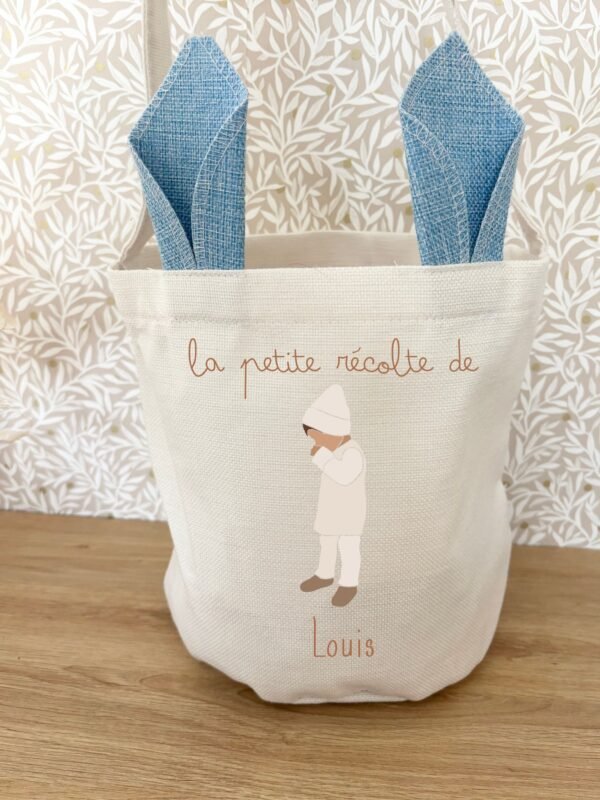Offrez à votre enfant un joli sac de Pâques personnalisé pour partir à la chasse aux œufs avec style ! Ce sac en tissu, orné de douces oreilles de lapin, est personnalisable avec une illustration représentant l’enfant et son prénom, pour une touche unique et magique.