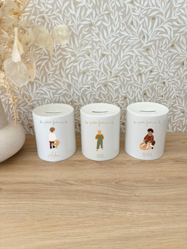 Aidez vos enfants à économiser avec style grâce à notre tirelire enfant personnalisée ! Fabriquée en céramique robuste, cette tirelire est non seulement un outil éducatif précieux mais aussi un bel objet décoratif pour la chambre de votre enfant. Avec des possibilités infinies de personnalisation, c’est un cadeau unique et mémorable pour toutes les occasions.